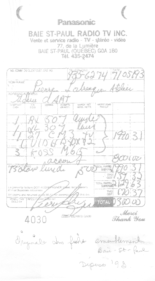 ENSEMBLE DE SON $ 2300.00 A L'ARRIVÉE À BAIE-ST-PAUL 11-05-1993